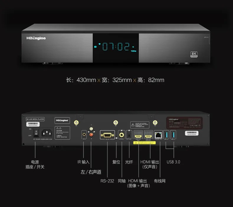 海缔力8K旗舰采用了前置隐藏式双硬盘仓设计,SATA3.0数据接口,支持30T以上超大容量硬盘存储,满足海量影音存储需求,方便且人性化。