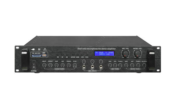 此系列产品是具有音箱处理功能的卡拉OK效果器,每部分功能都独立可调。  用24Bit数据总线双混响;  麦克风自带反馈抑制;  MIC通道四路输入,一路48V幻象电源支持电容麦输入;  内置USB/SD接口,远距离蓝牙接收;  本机设有