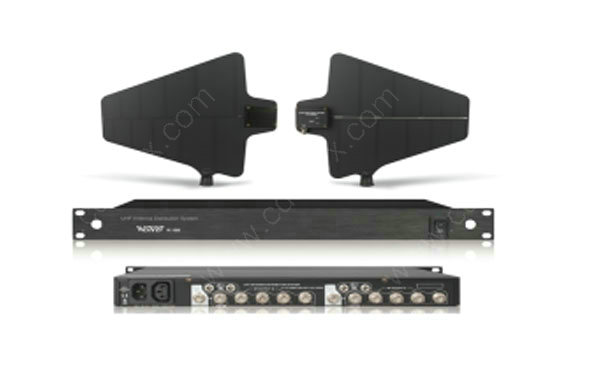 信号分配器工作频率为450-950MHZ,适用任何品牌分集式接收机,可连接5台接收机,具备串接功能。信号分配器提供4组DC12V/1A电源供接收机用。本系统能稳定接收信号,增强有效距离达300米以上。是演艺扩声工程必备利器。